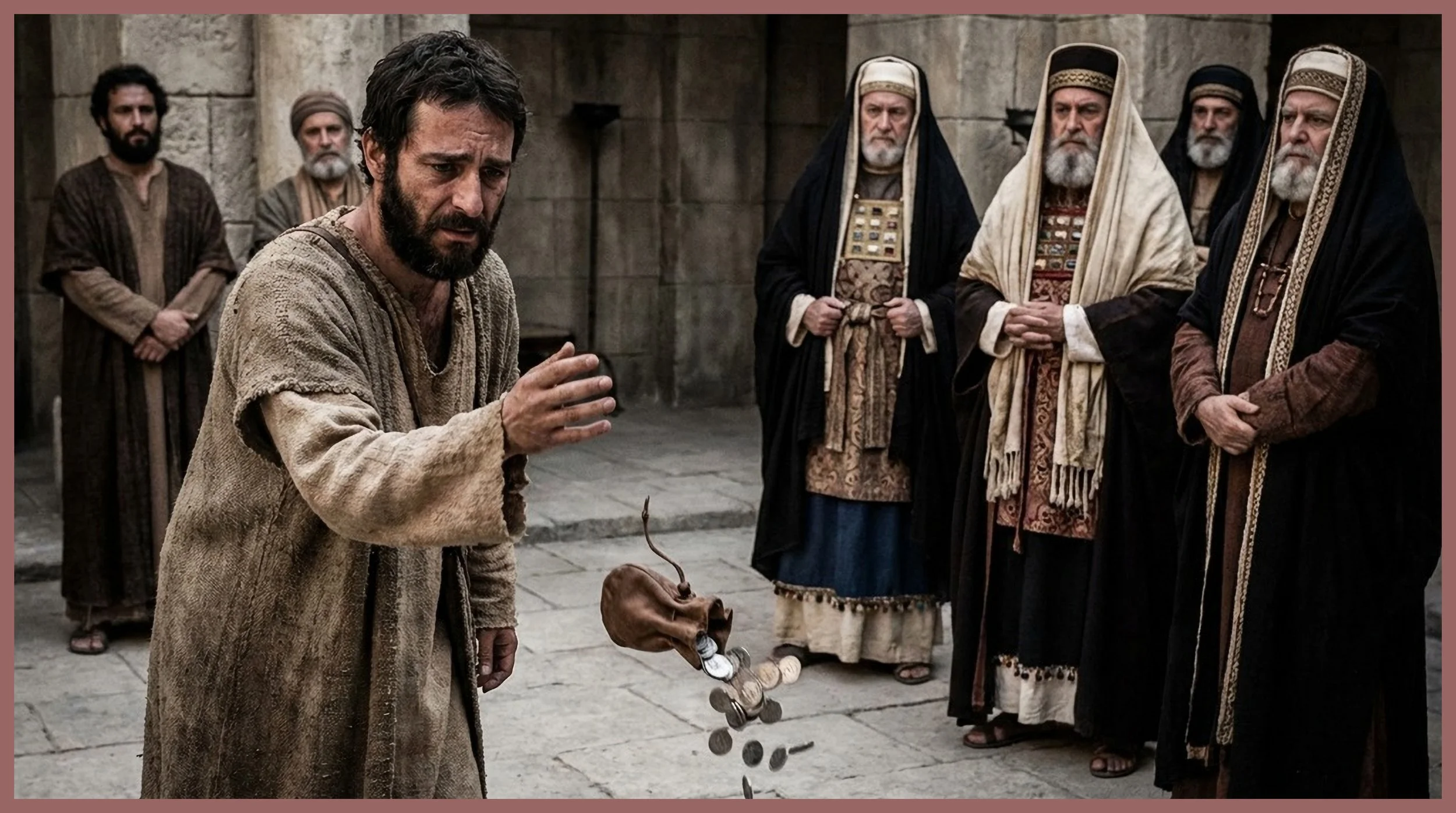 “I have betrayed innocent blood,” he cries, but their cynical response is, “That’s your problem.” Judas throws the silver down and runs out and hangs himself.